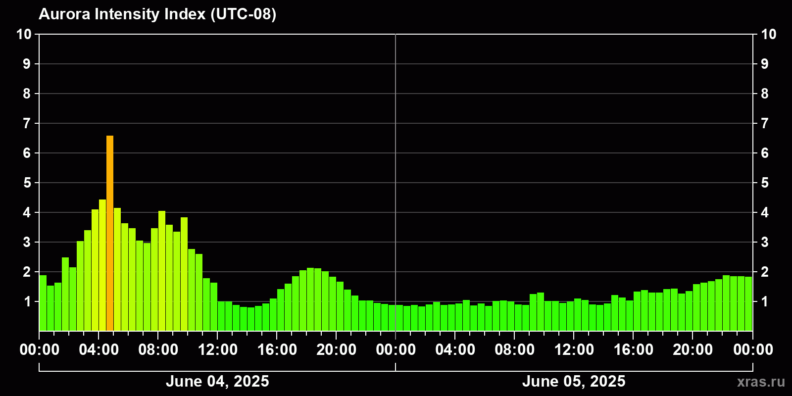 Changes in the auroral intensity index from 2025-06-04 to 2025-06-05 local time