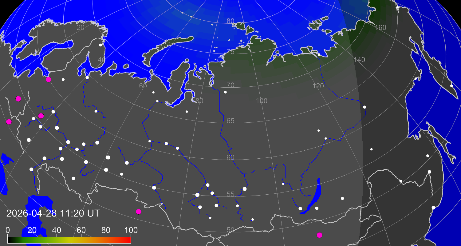 Northern lights (auroras) over the territory of Eurasia