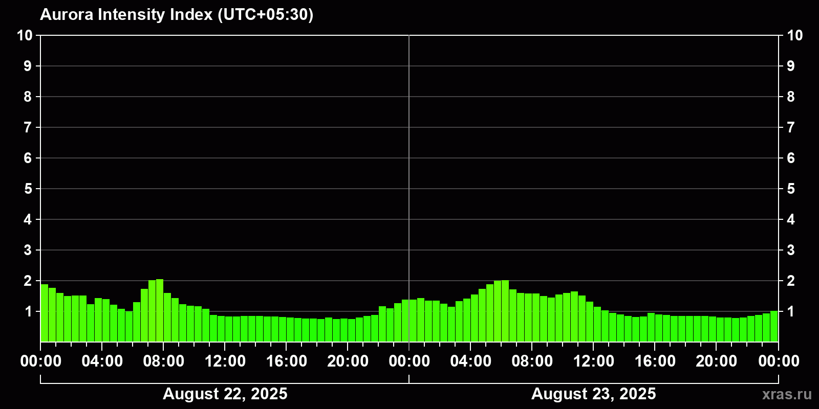 Changes in the auroral intensity index from 2025-08-22 to 2025-08-23 local time
