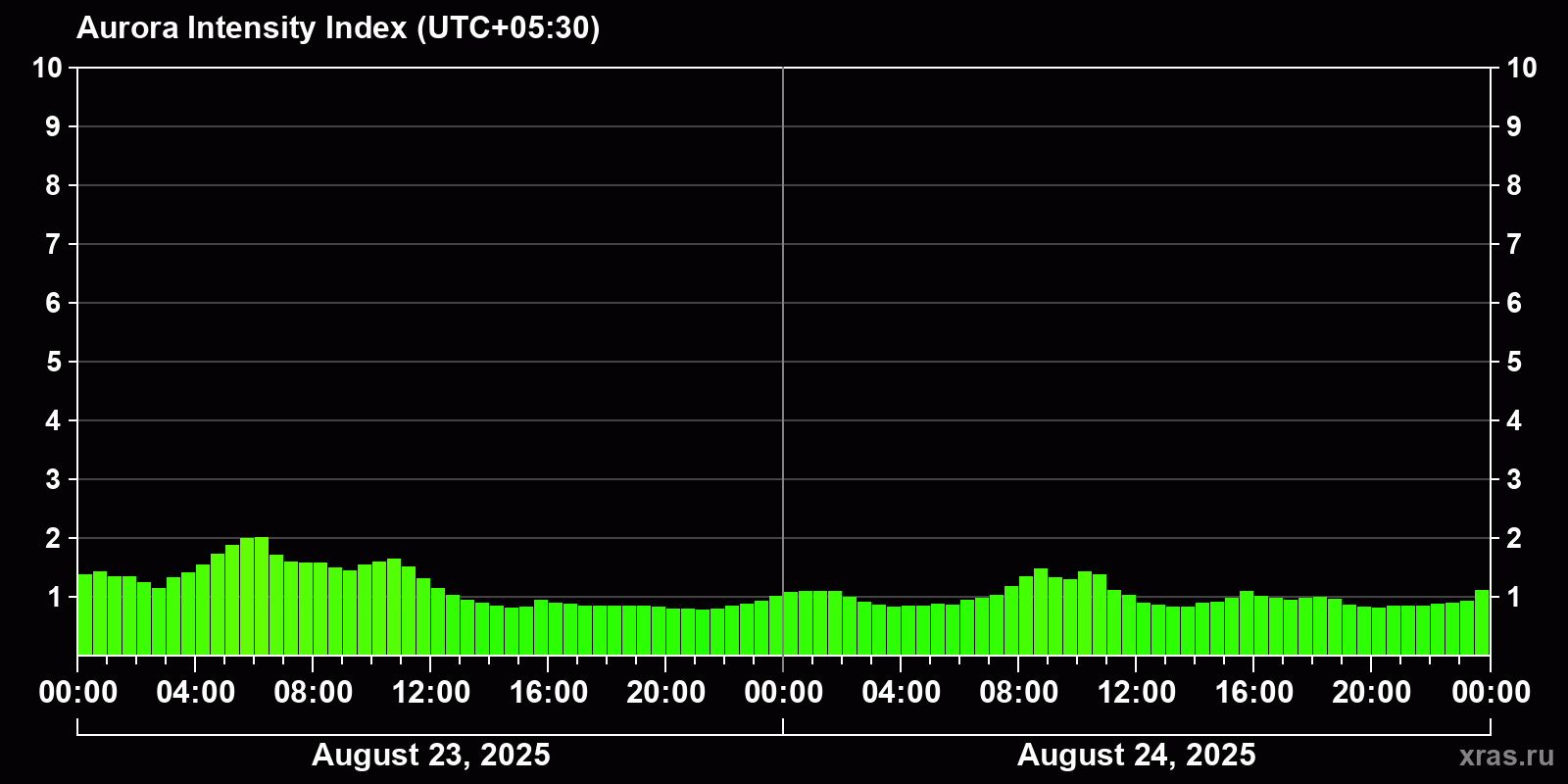 Changes in the auroral intensity index from 2025-08-23 to 2025-08-24 local time