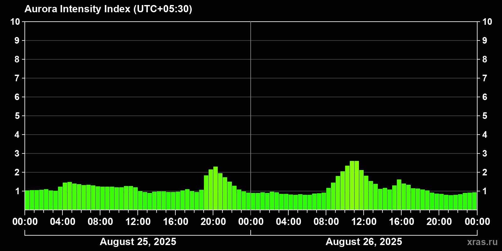 Changes in the auroral intensity index from 2025-08-25 to 2025-08-26 local time
