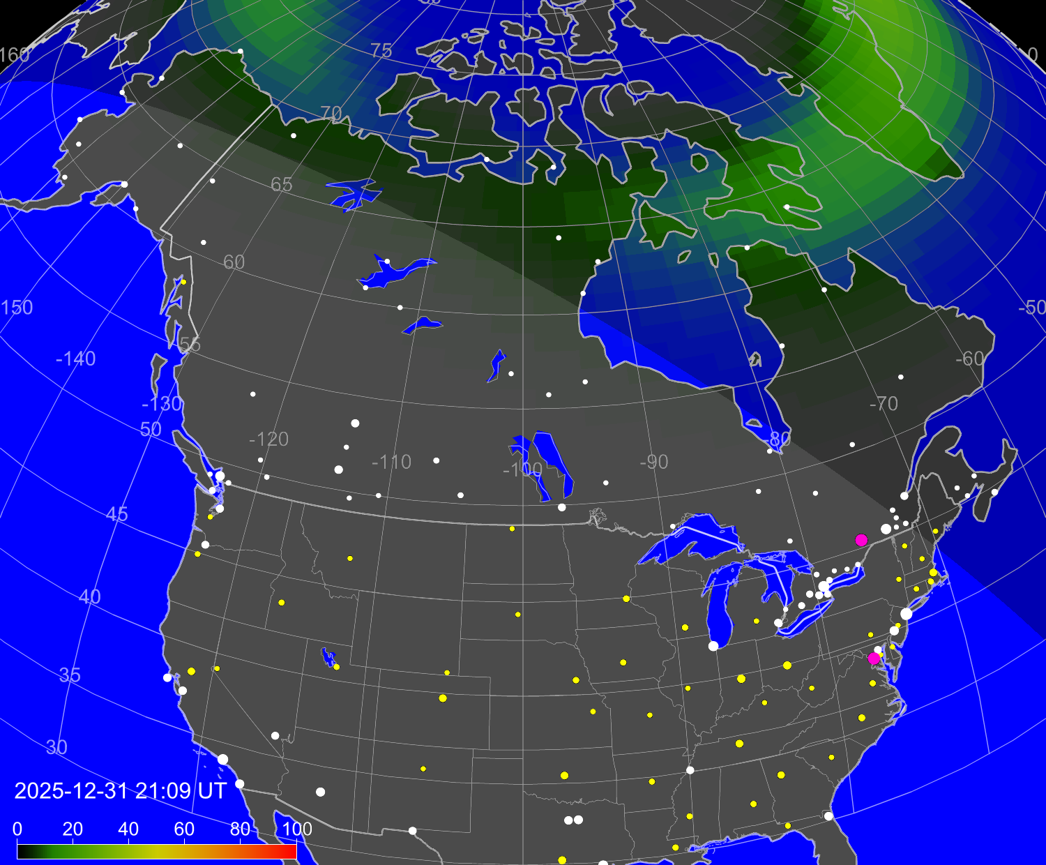 Индекс интенсивности полярных сияний и теоретически возможная широта наблюдений для ночного времени в западном полушарии