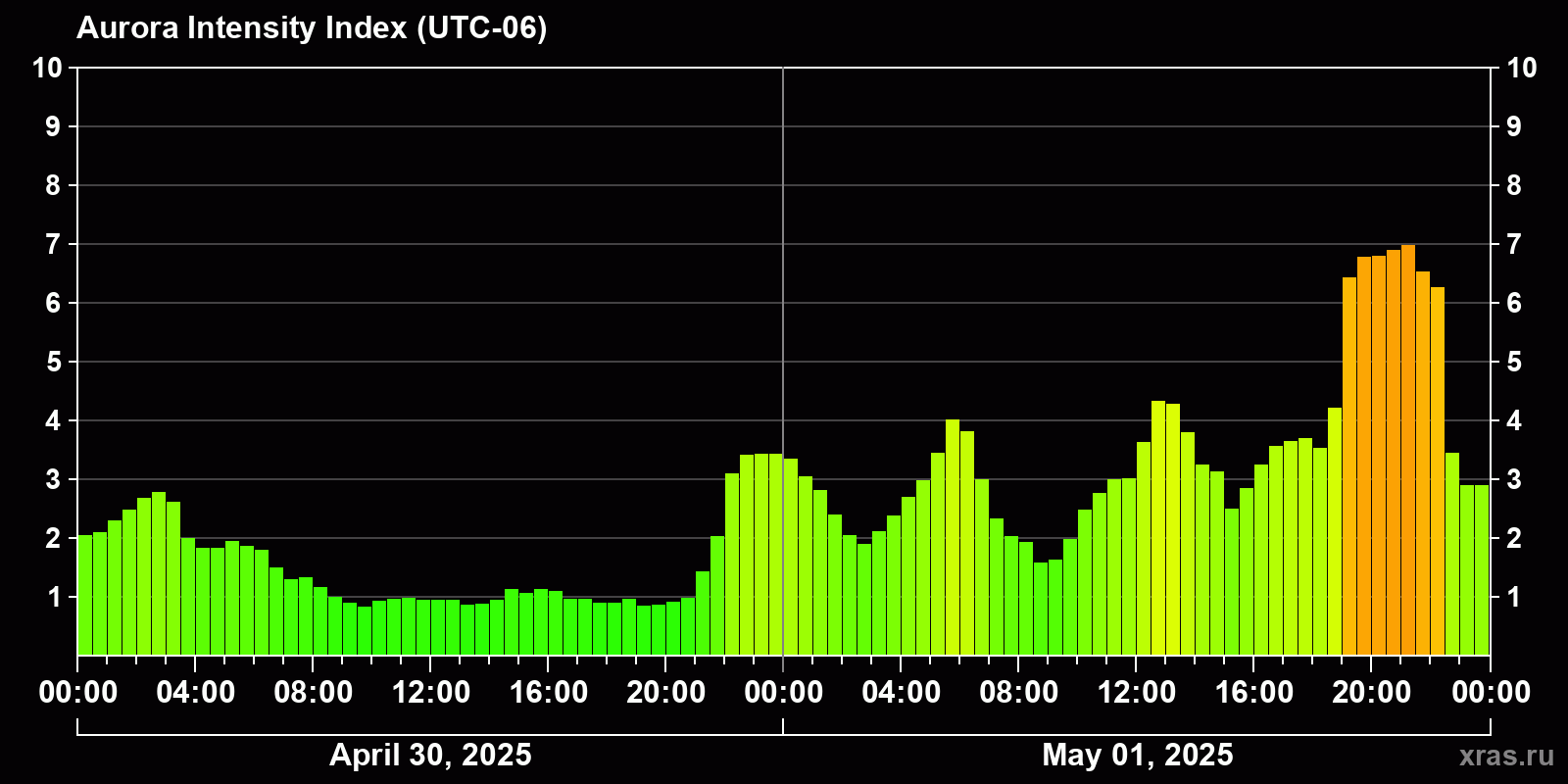 Auroral intensity index and the theoretically possible latitude of observations for nighttime in the Western Hemisphere as of 2025-05-01 23:48 (end of day) local time