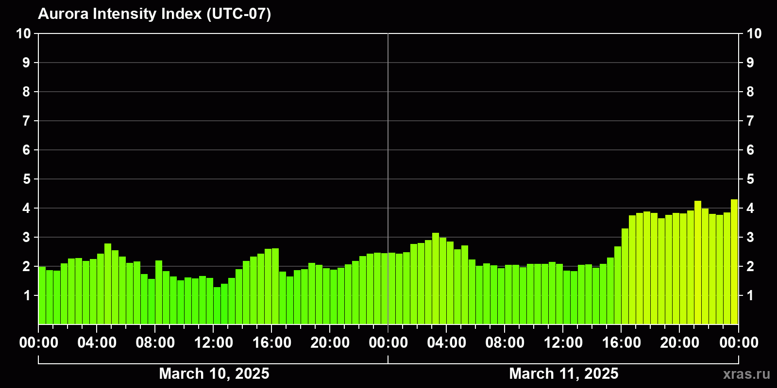 Auroral intensity index and the theoretically possible latitude of observations for nighttime in the Western Hemisphere as of 2025-03-11 23:48 (end of day) local time