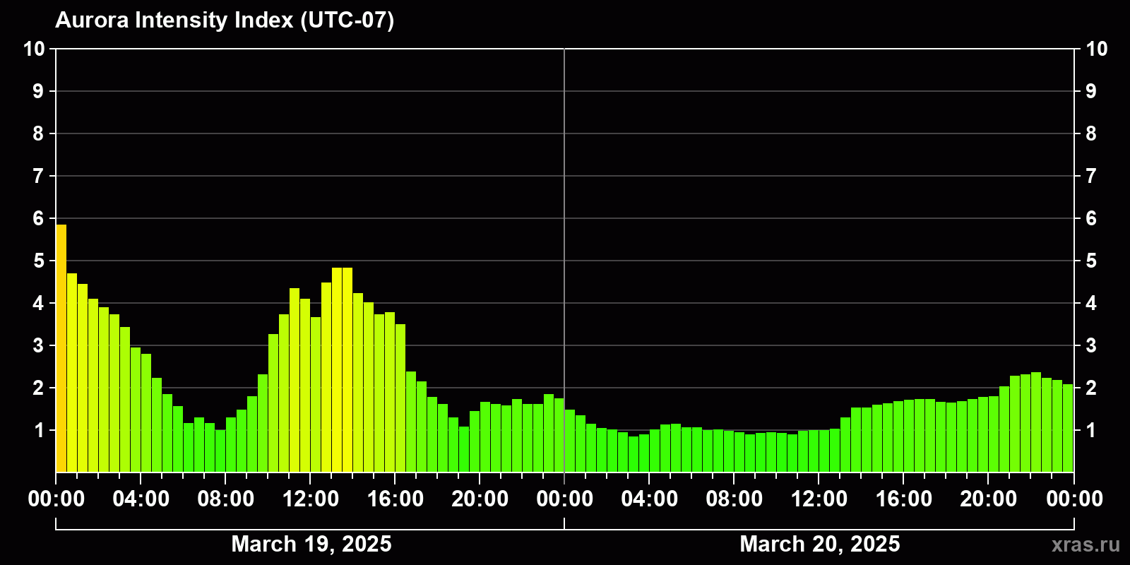Auroral intensity index and the theoretically possible latitude of observations for nighttime in the Western Hemisphere as of 2025-03-20 23:48 (end of day) local time