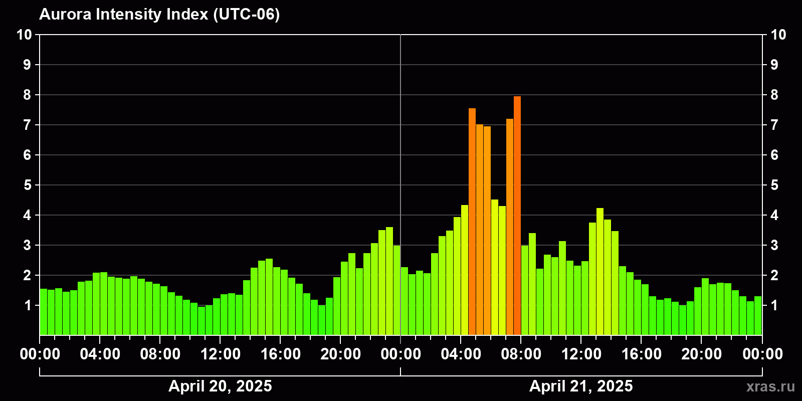 Changes in the auroral intensity index from 2025-04-20 to 2025-04-21 local time