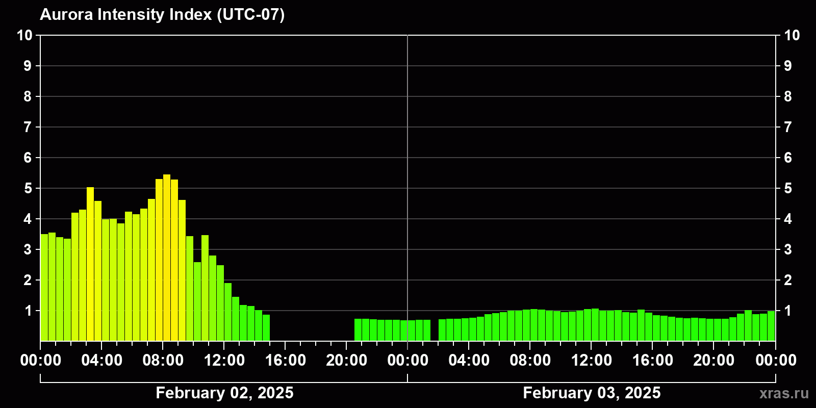 Auroral intensity index and the theoretically possible latitude of observations for nighttime in the Western Hemisphere as of 2025-02-03 23:56 (end of day) local time