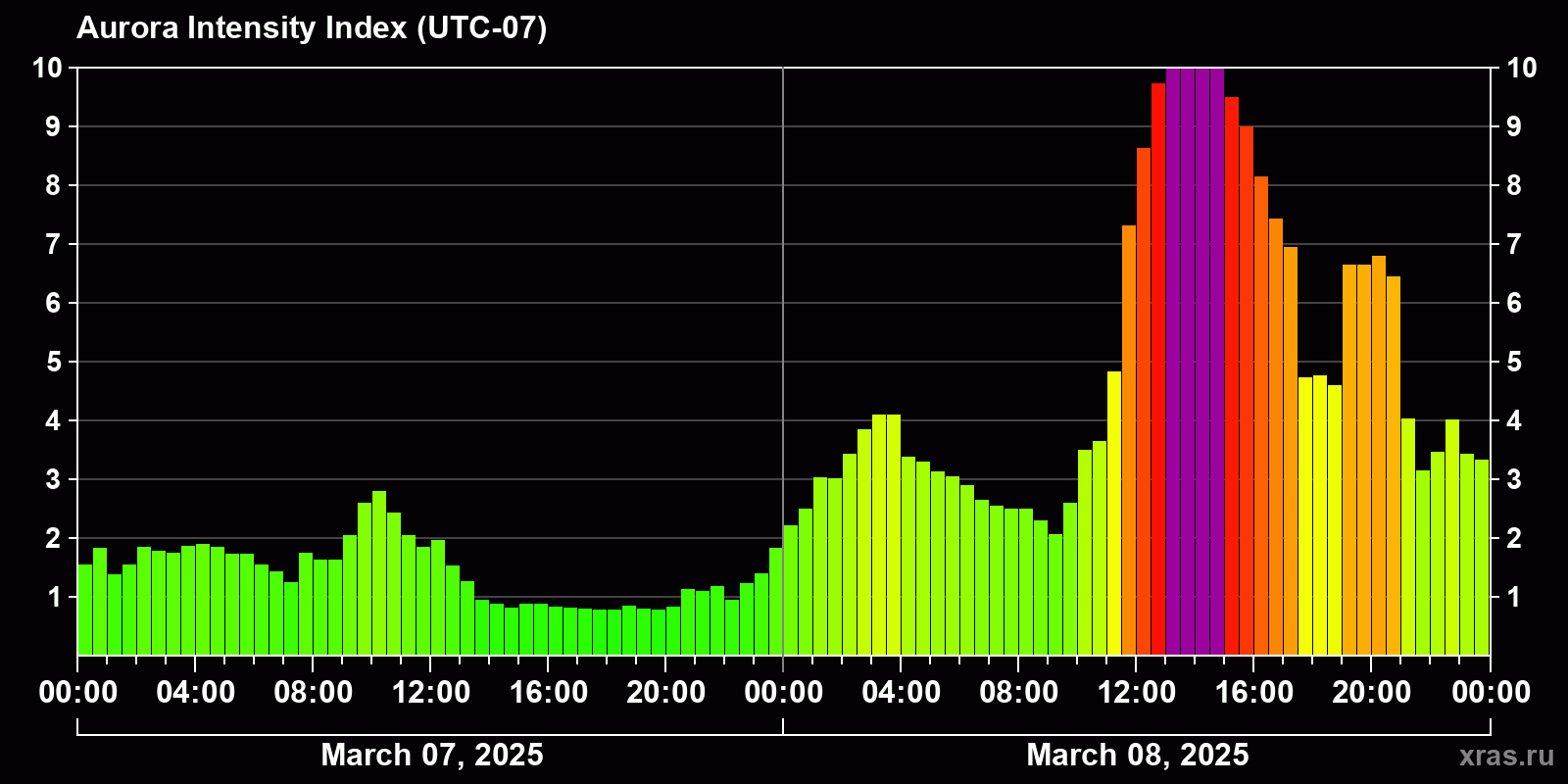 Changes in the auroral intensity index from 2025-03-07 to 2025-03-08 local time