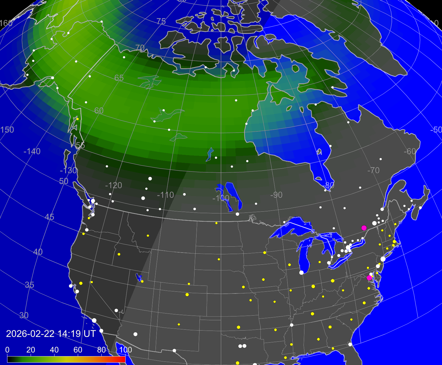 Вероятность полярных сияний в городах Канады