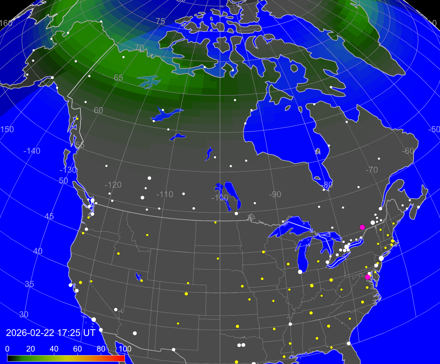 Зона полярных (северных) сияний над территорией Северной Америки