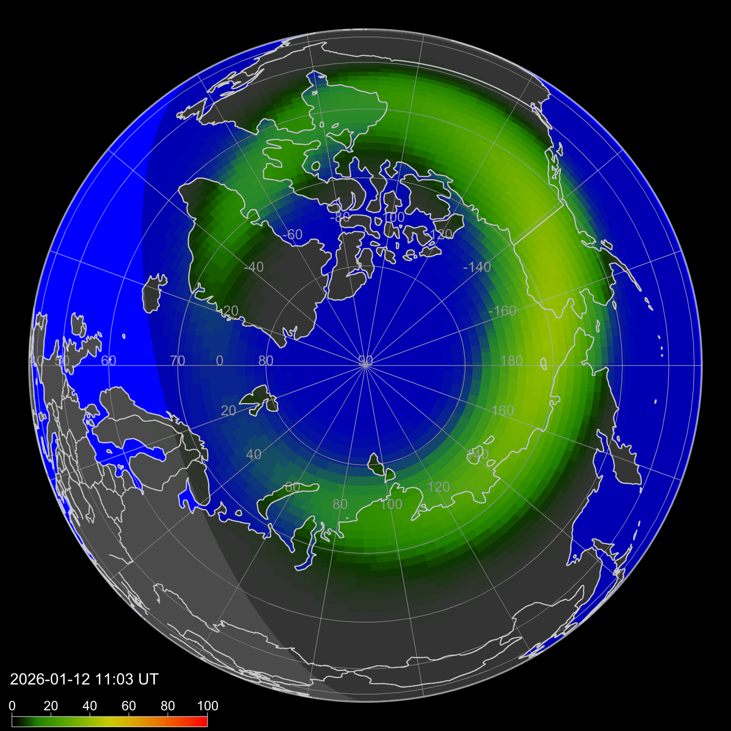 Изменения и часовой прогноз индекса интенсивности полярных сияний с 2026-01-12 по 2026-01-13