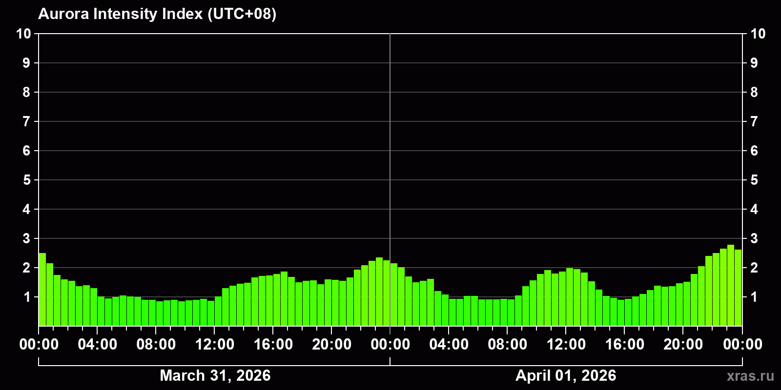 Changes in the auroral intensity index from 2026-03-31 to 2026-04-01 local time