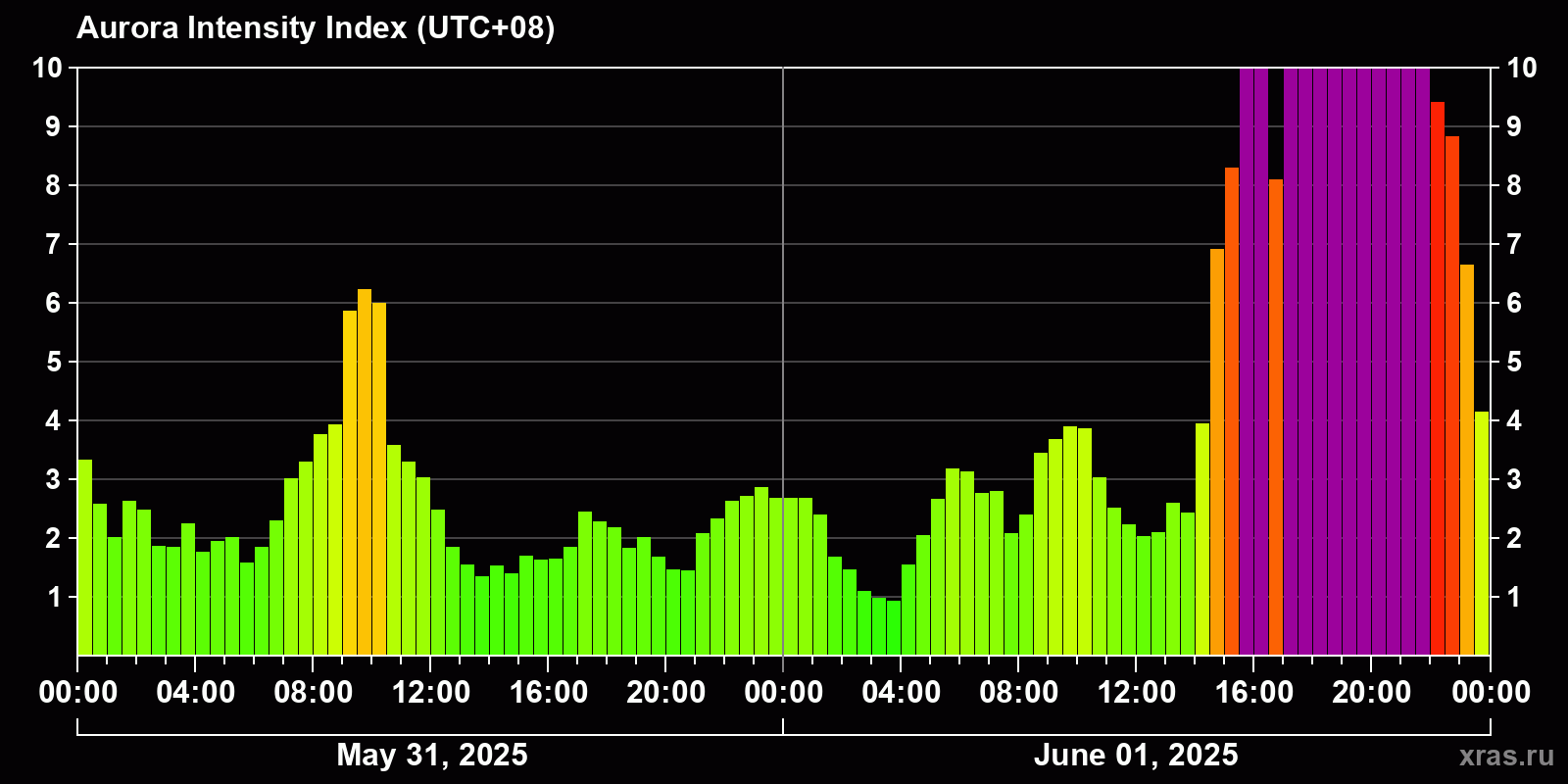 Changes in the auroral intensity index from 2025-05-31 to 2025-06-01 local time