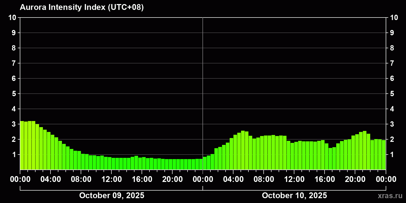 Auroral intensity index and the theoretically possible latitude of observations for nighttime in the Estern Hemisphere as of 2025-10-10 23:50 (end of day) local time