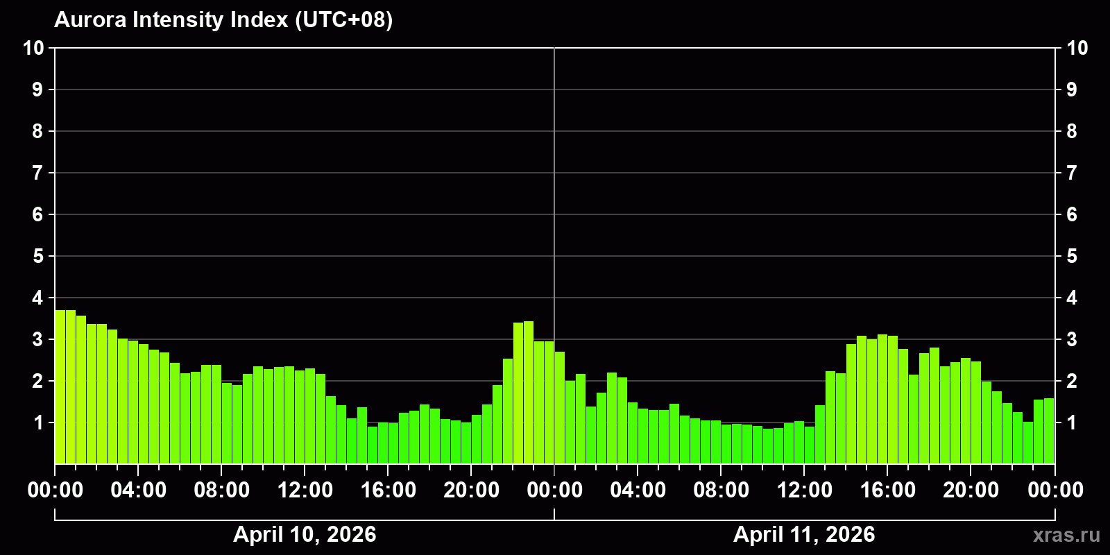 Changes in the auroral intensity index from 2026-04-10 to 2026-04-11 local time