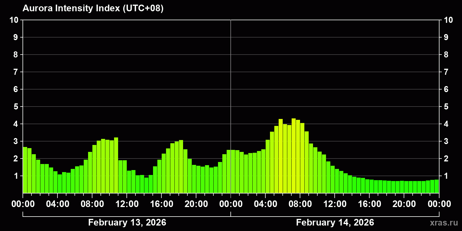 Auroral intensity index and the theoretically possible latitude of observations for nighttime in the Estern Hemisphere as of 2026-02-14 23:51 (end of day) local time