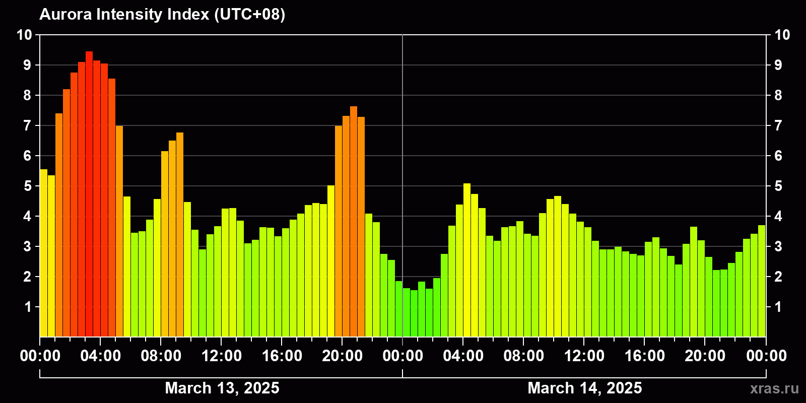 Changes in the auroral intensity index from 2025-03-13 to 2025-03-14 local time