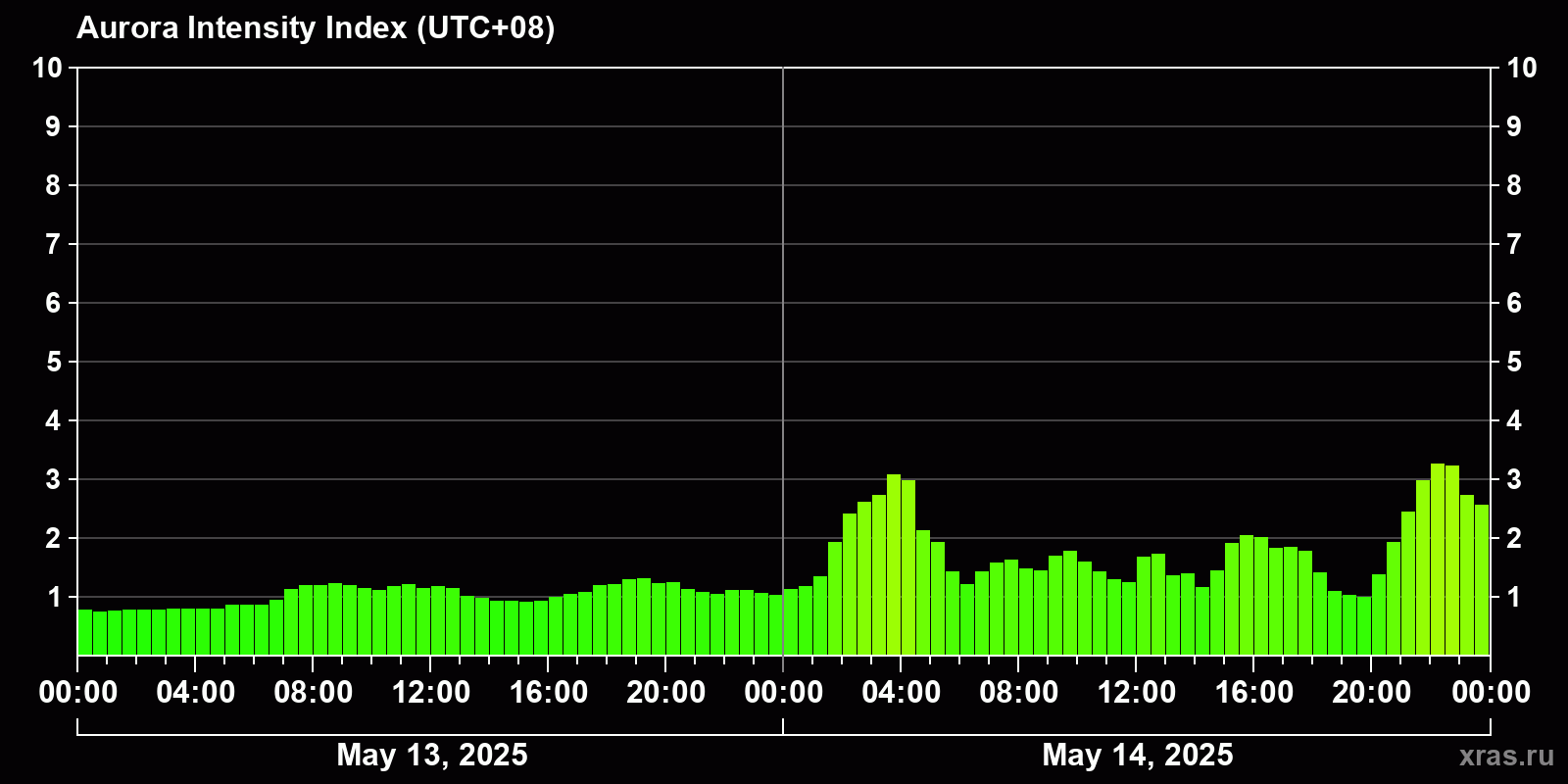 Auroral intensity index and the theoretically possible latitude of observations for nighttime in the Estern Hemisphere as of 2025-05-14 23:55 (end of day) local time