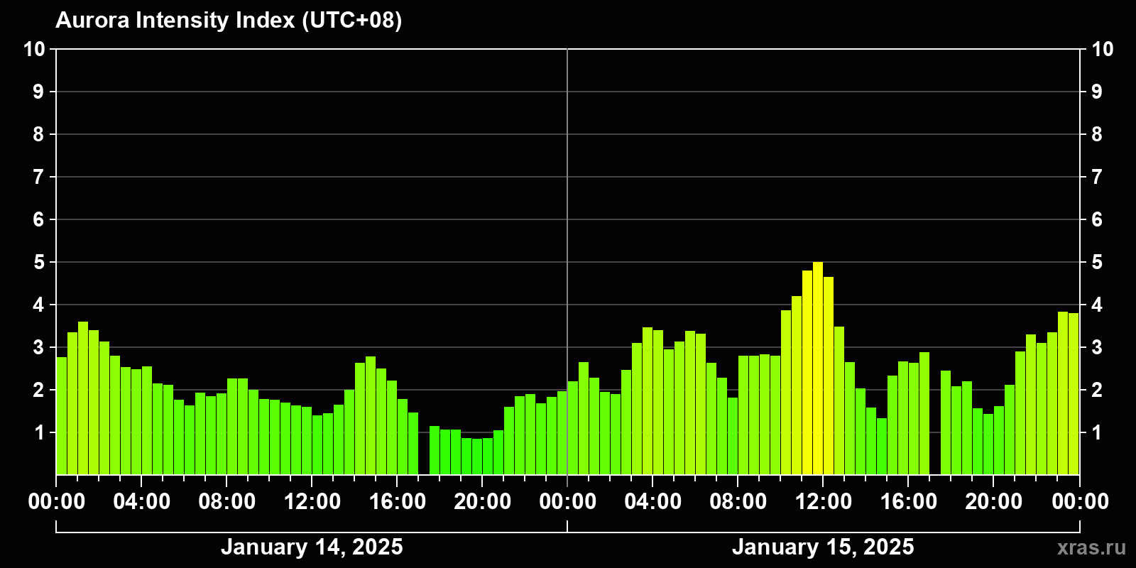 Auroral intensity index and the theoretically possible latitude of observations for nighttime in the Estern Hemisphere as of 2025-01-15 23:50 (end of day) local time