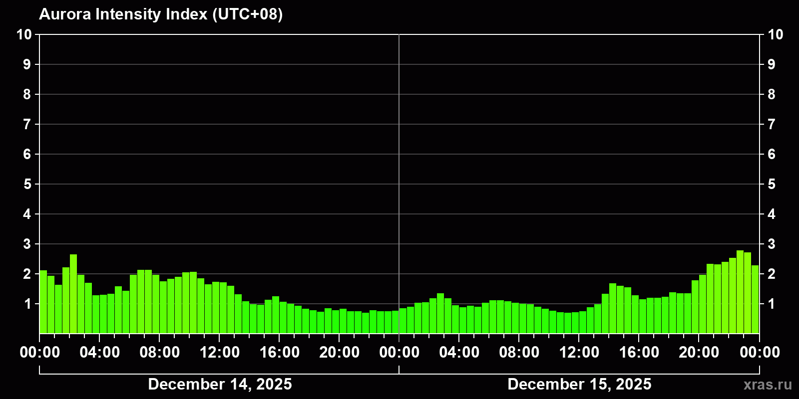 Auroral intensity index and the theoretically possible latitude of observations for nighttime in the Estern Hemisphere as of 2025-12-15 23:59 (end of day) local time