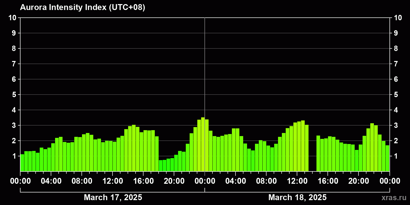 Auroral intensity index and the theoretically possible latitude of observations for nighttime in the Estern Hemisphere as of 2025-03-18 23:48 (end of day) local time