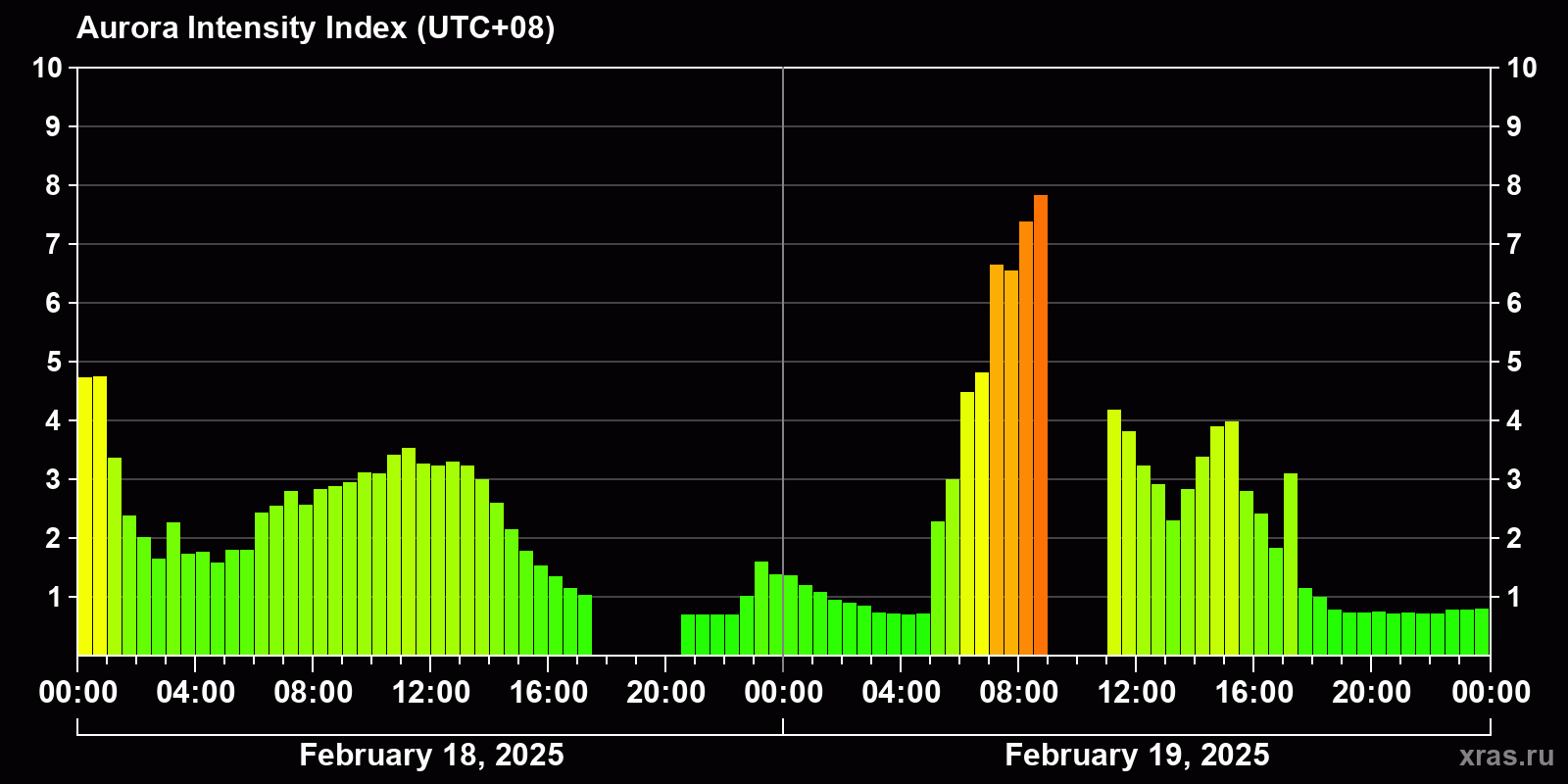 Changes in the auroral intensity index from 2025-02-18 to 2025-02-19 local time
