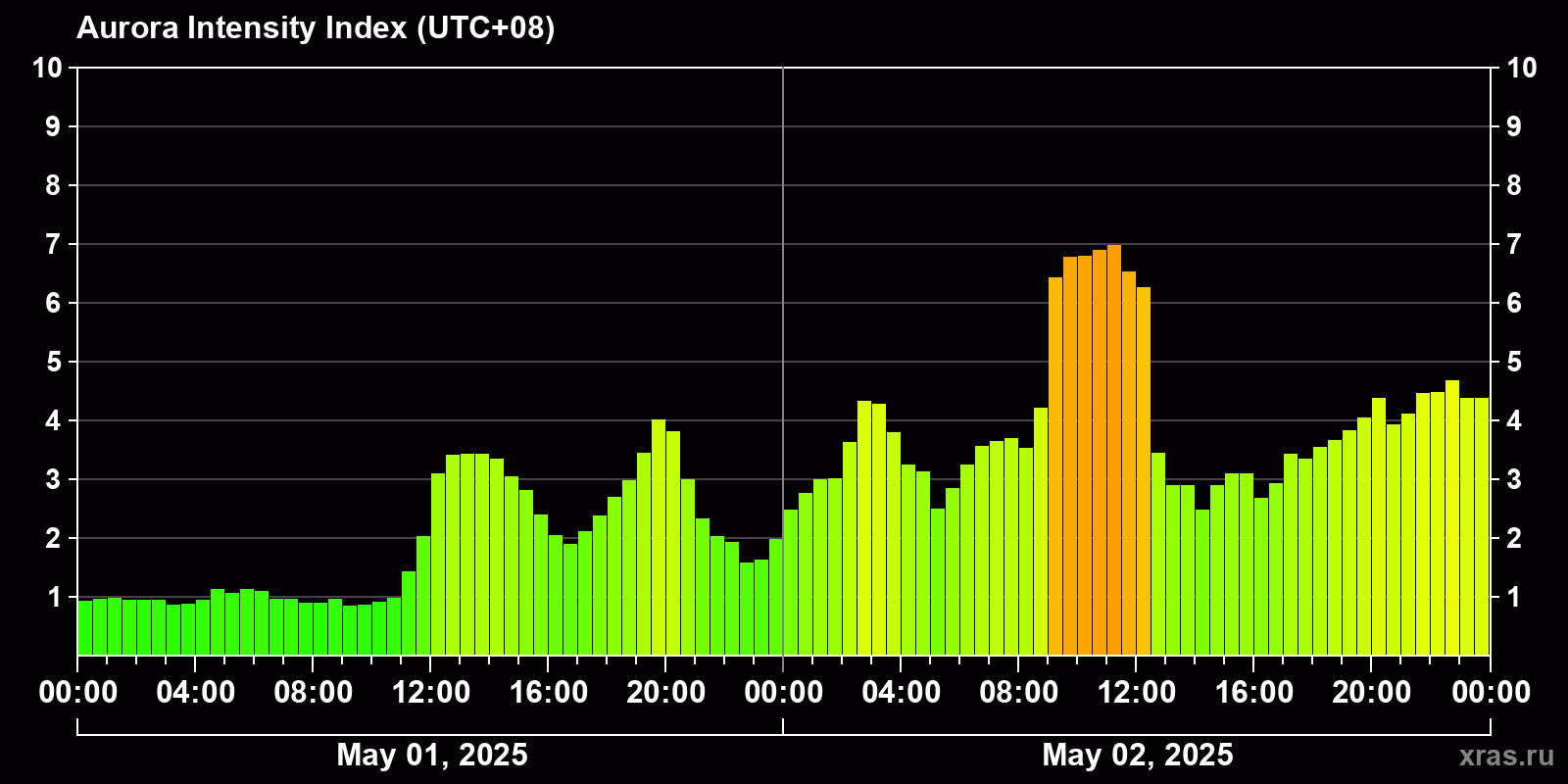 Changes in the auroral intensity index from 2025-05-01 to 2025-05-02 local time