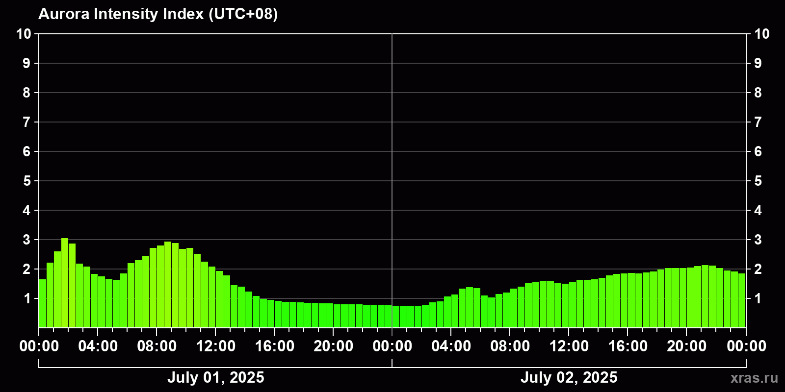 Changes in the auroral intensity index from 2025-07-01 to 2025-07-02 local time