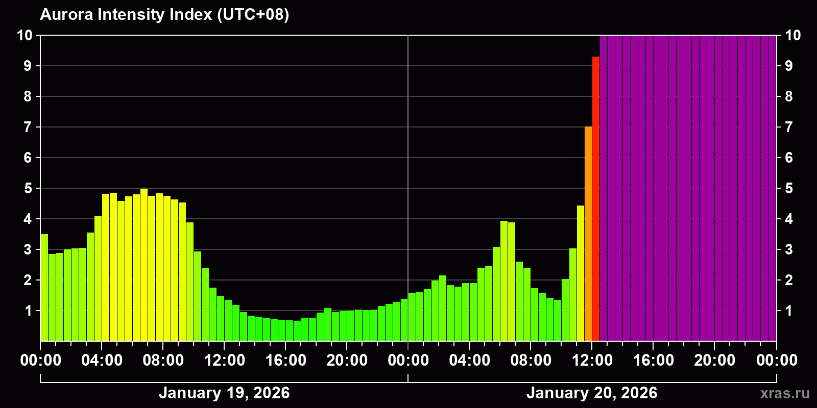 Auroral intensity index and the theoretically possible latitude of observations for nighttime in the Estern Hemisphere as of 2026-01-20 23:46 (end of day) local time