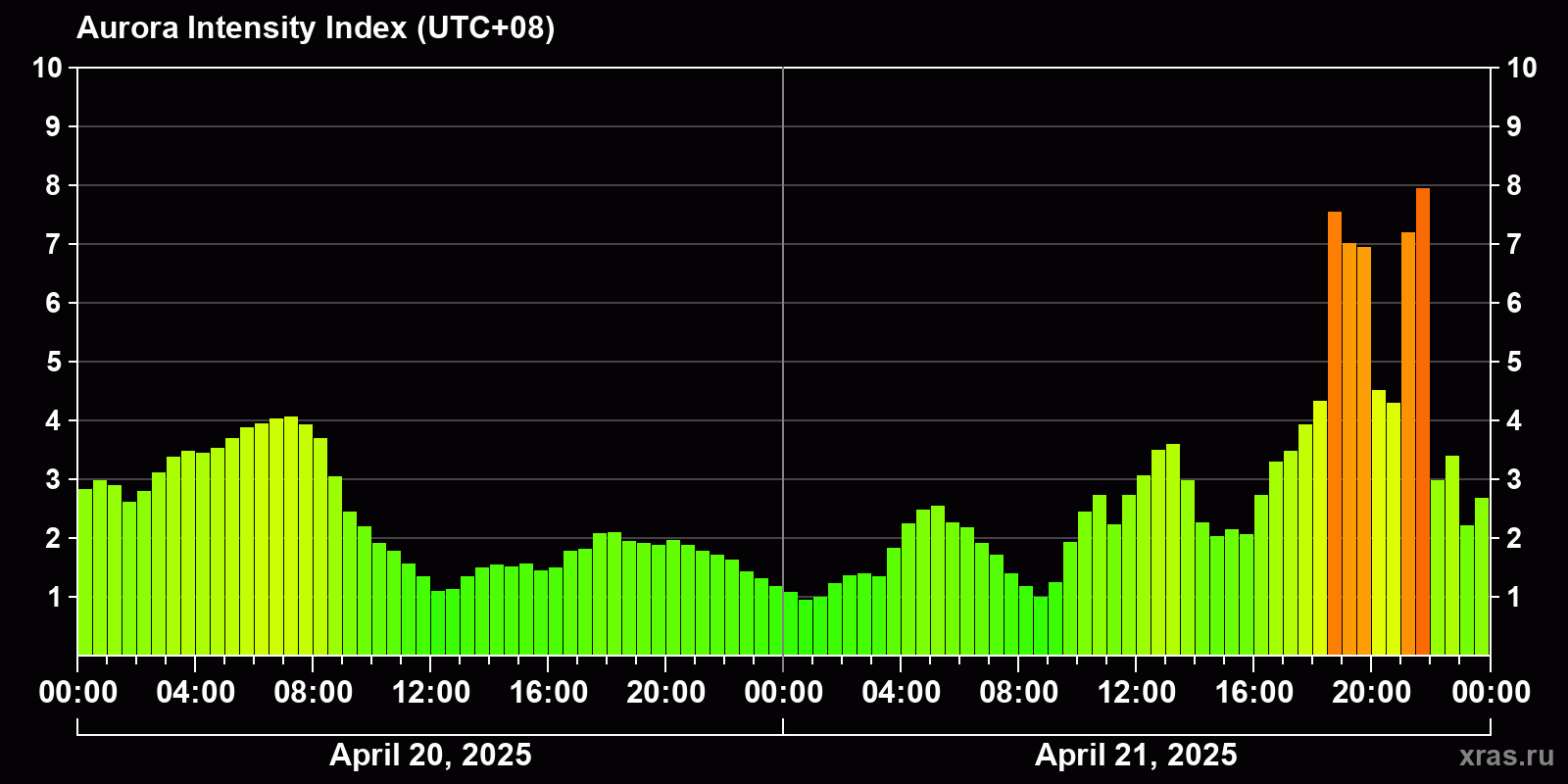 Changes in the auroral intensity index from 2025-04-20 to 2025-04-21 local time