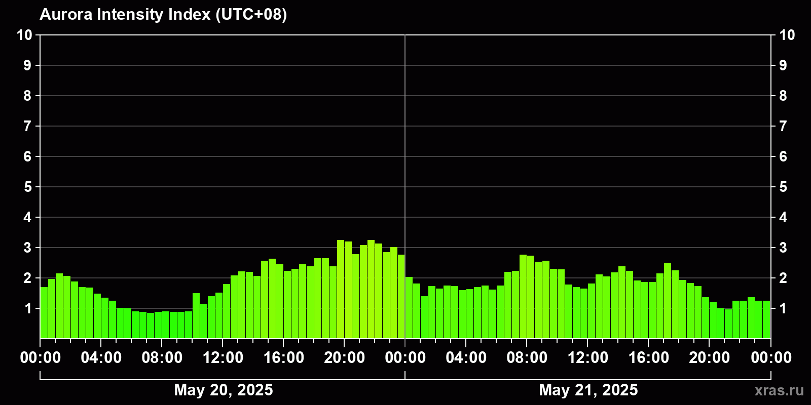 Changes in the auroral intensity index from 2025-05-20 to 2025-05-21 local time