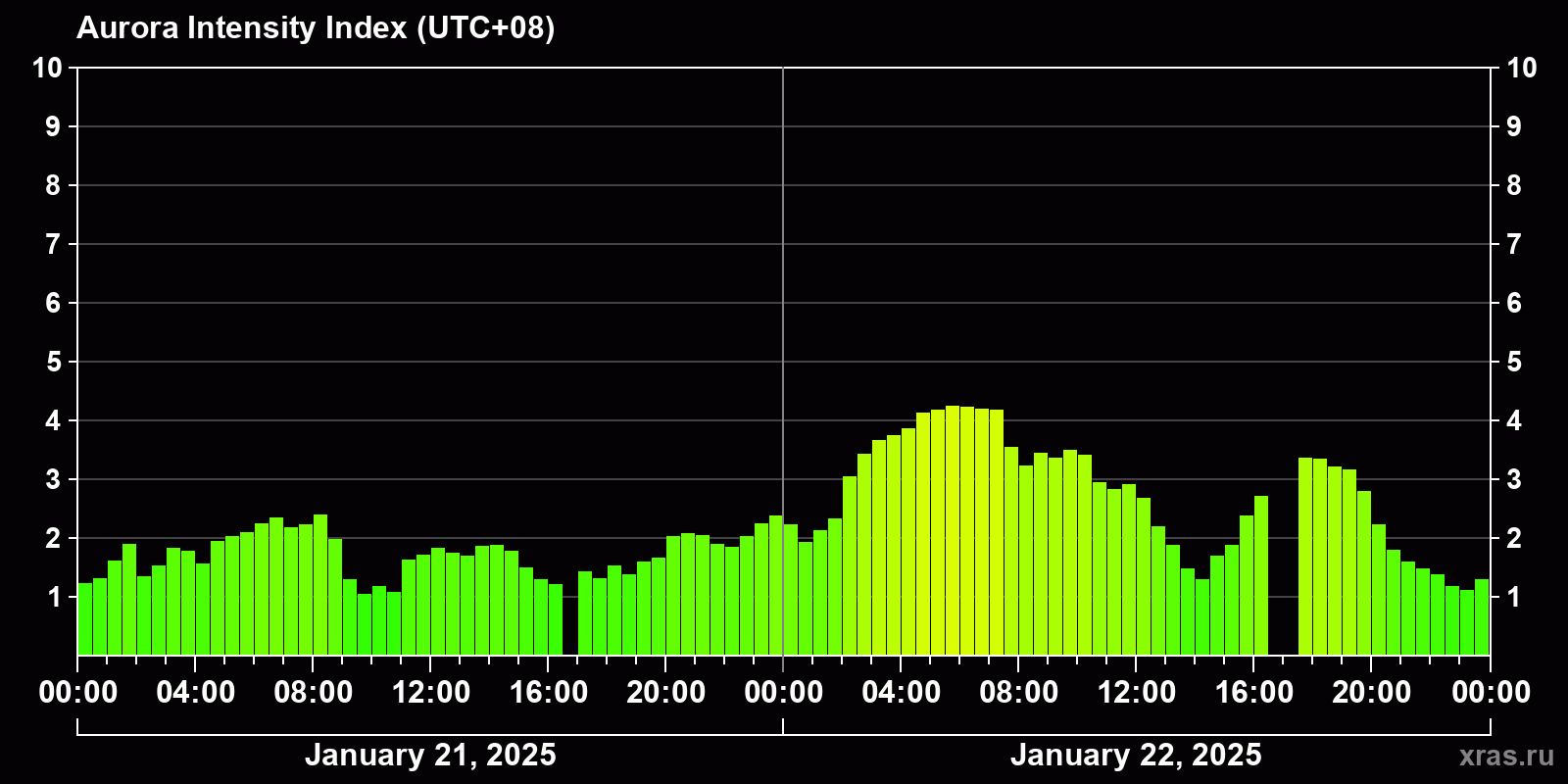 Changes in the auroral intensity index from 2025-01-21 to 2025-01-22 local time