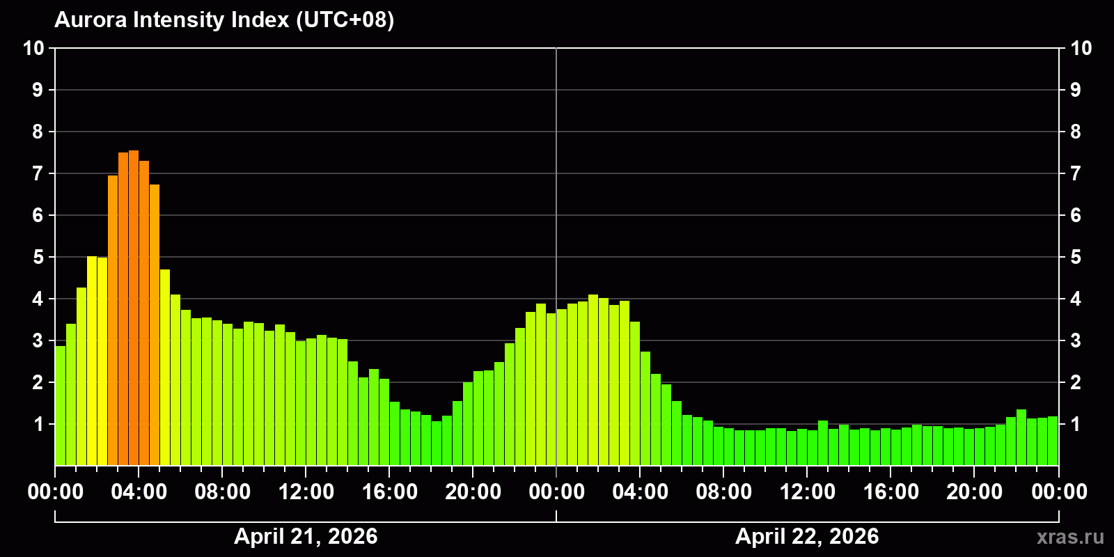 Changes in the auroral intensity index from 2026-04-21 to 2026-04-22 local time