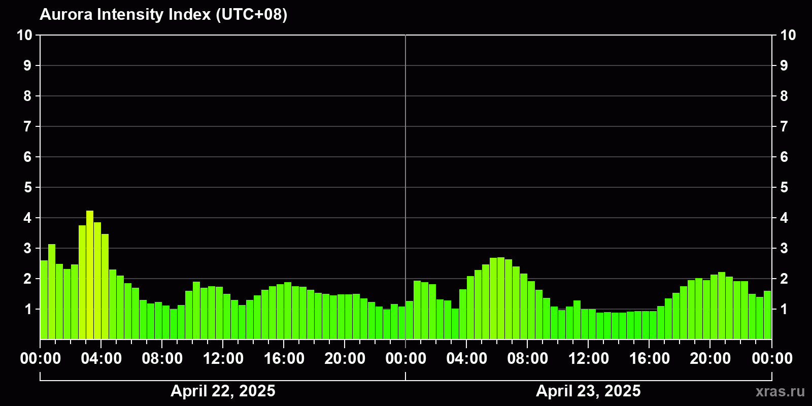 Auroral intensity index and the theoretically possible latitude of observations for nighttime in the Estern Hemisphere as of 2025-04-23 23:52 (end of day) local time