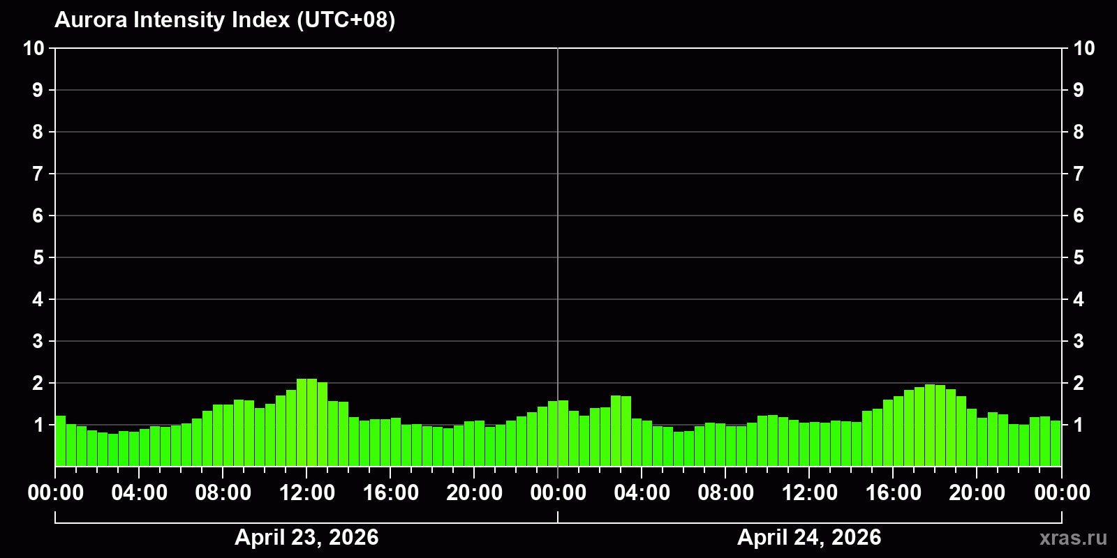 Auroral intensity index and the theoretically possible latitude of observations for nighttime in the Estern Hemisphere as of 2026-04-24 23:48 (end of day) local time