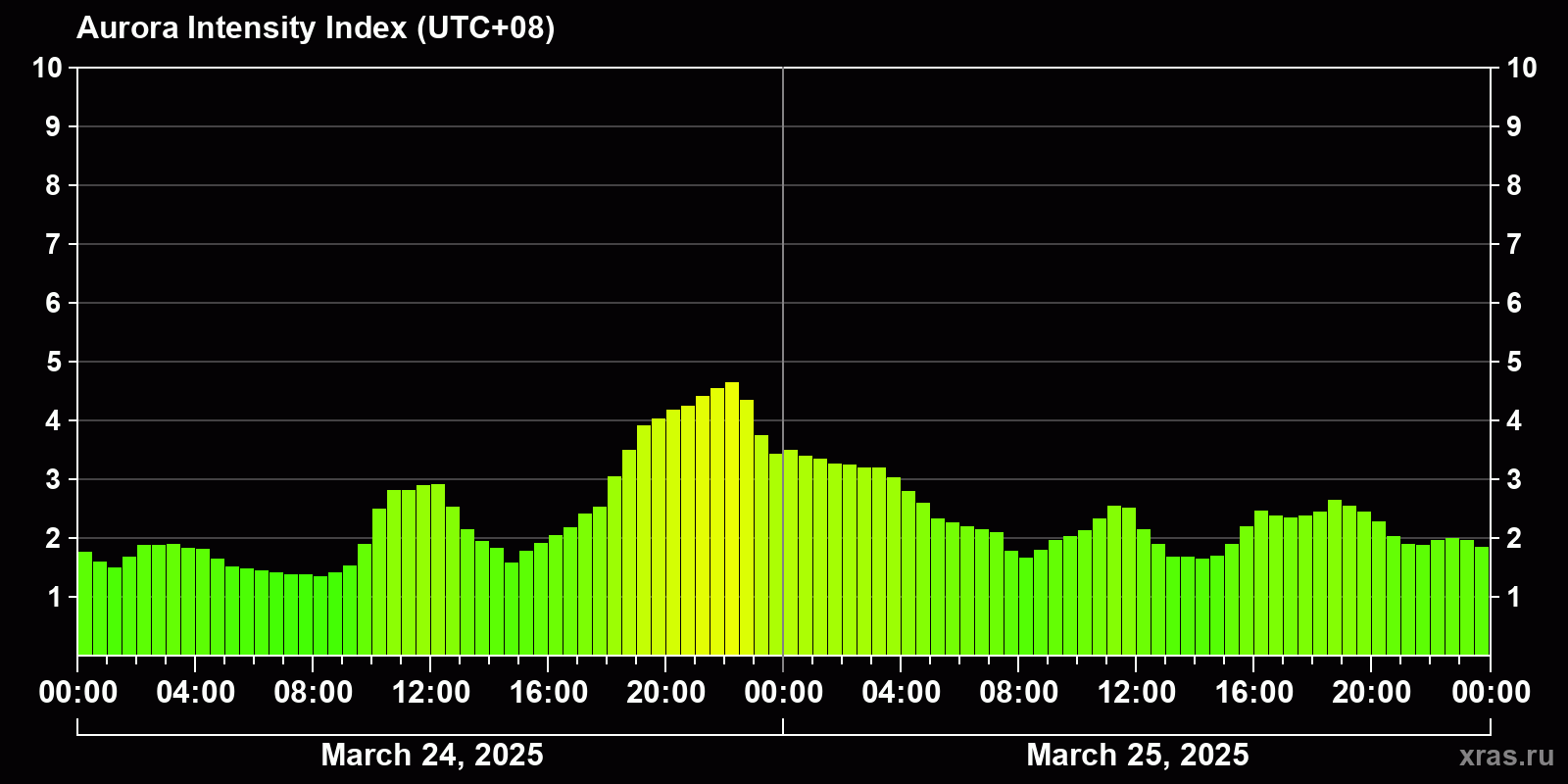 Auroral intensity index and the theoretically possible latitude of observations for nighttime in the Estern Hemisphere as of 2025-03-25 23:51 (end of day) local time