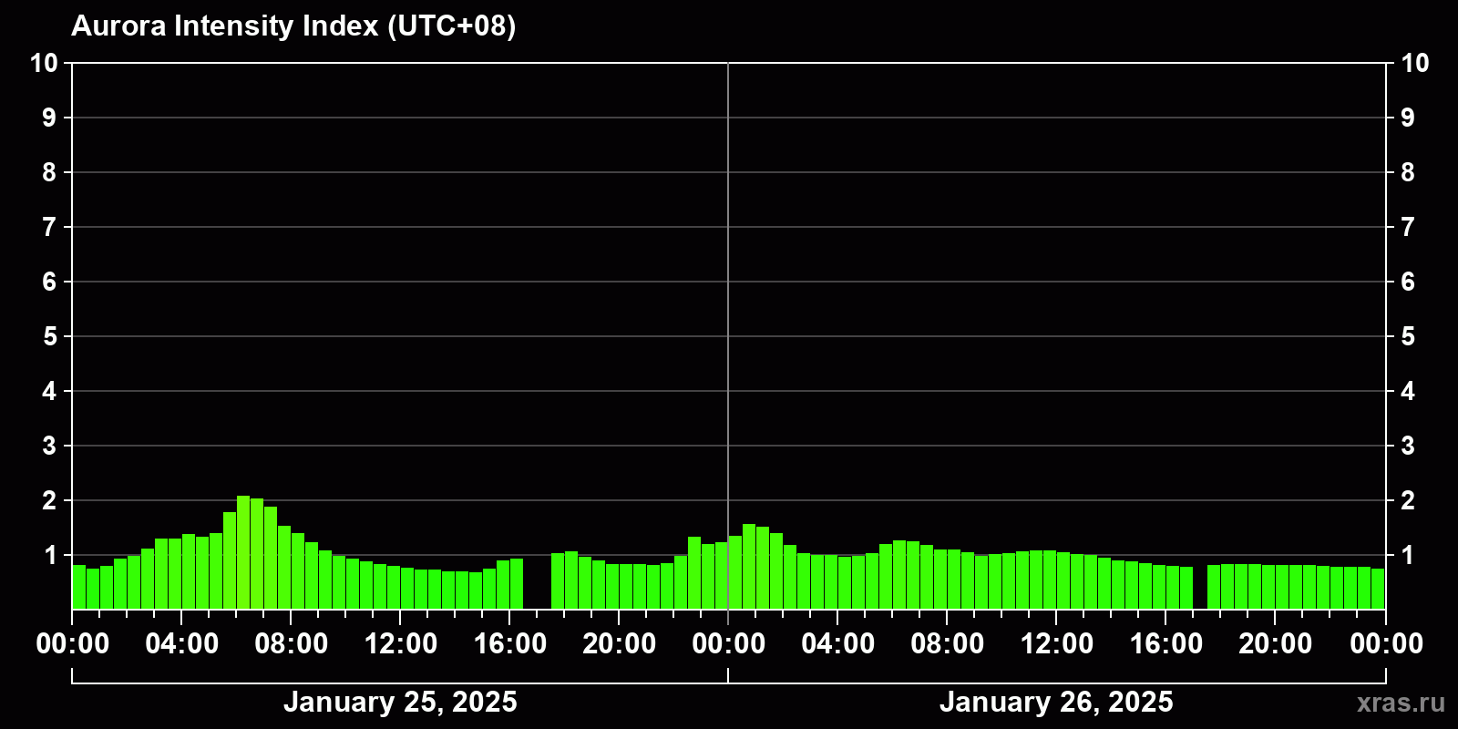 Auroral intensity index and the theoretically possible latitude of observations for nighttime in the Estern Hemisphere as of 2025-01-26 23:54 (end of day) local time