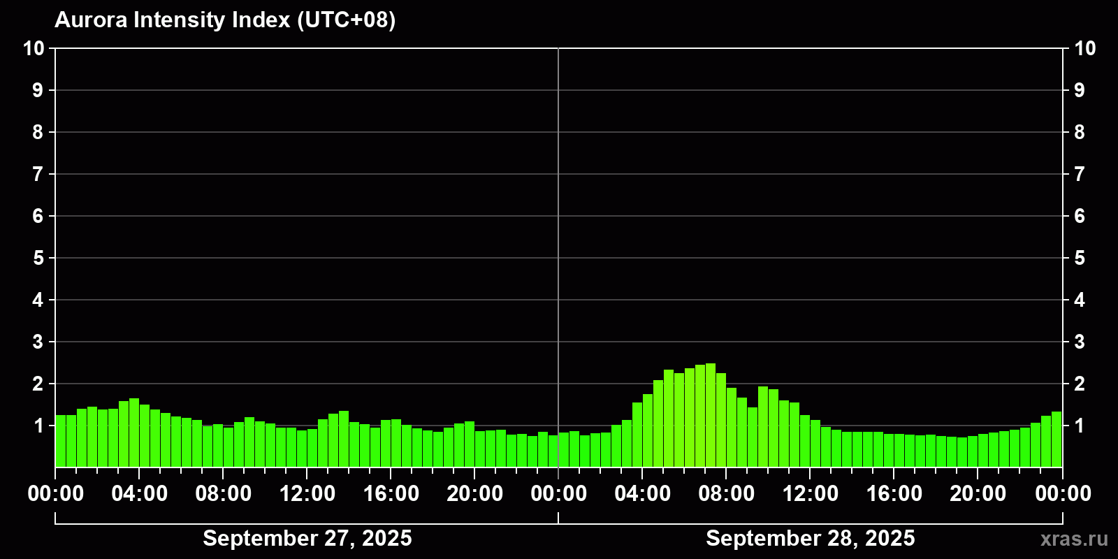 Changes in the auroral intensity index from 2025-09-27 to 2025-09-28 local time