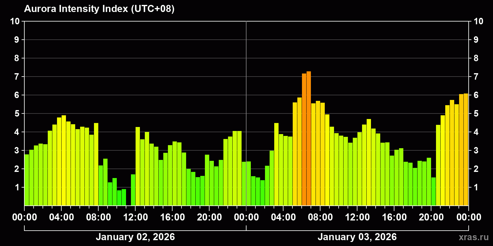 Changes in the auroral intensity index from 2026-01-02 to 2026-01-03 local time