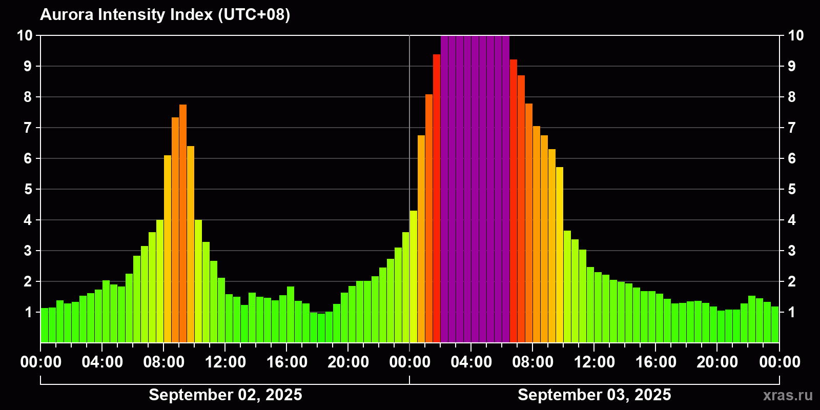 Changes in the auroral intensity index from 2025-09-02 to 2025-09-03 local time