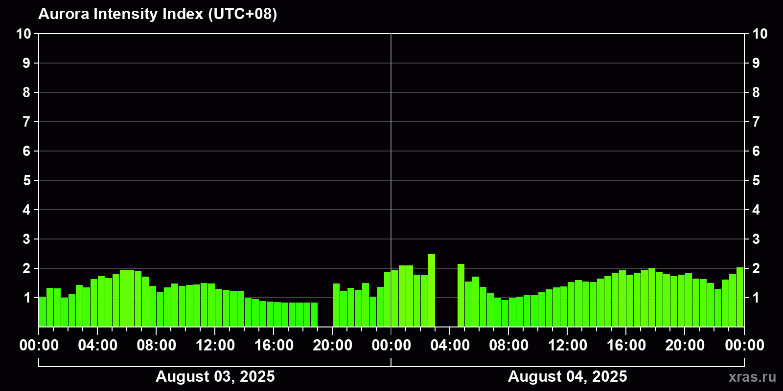 Changes in the auroral intensity index from 2025-08-03 to 2025-08-04 local time