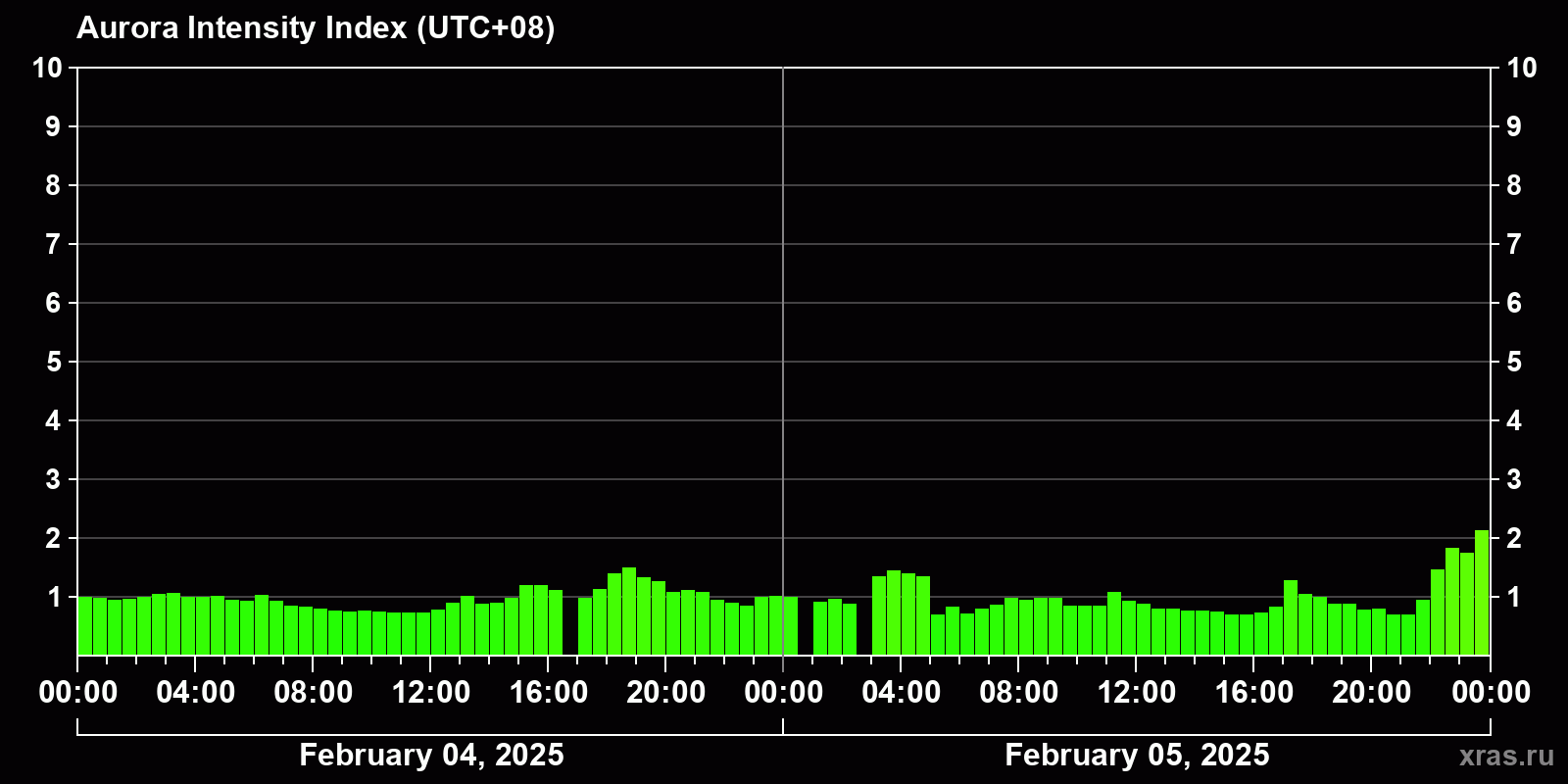 Changes in the auroral intensity index from 2025-02-04 to 2025-02-05 local time