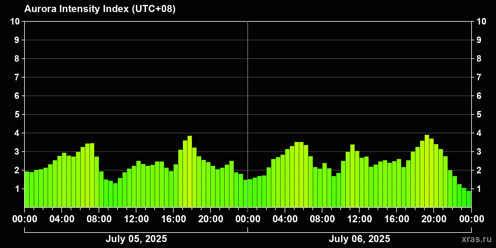 Changes in the auroral intensity index from 2025-07-05 to 2025-07-06 local time