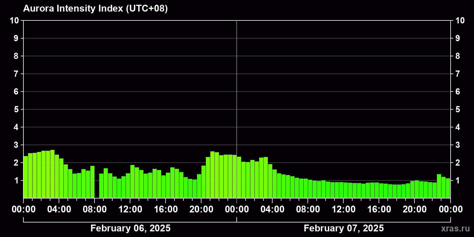Changes in the auroral intensity index from 2025-02-06 to 2025-02-07 local time