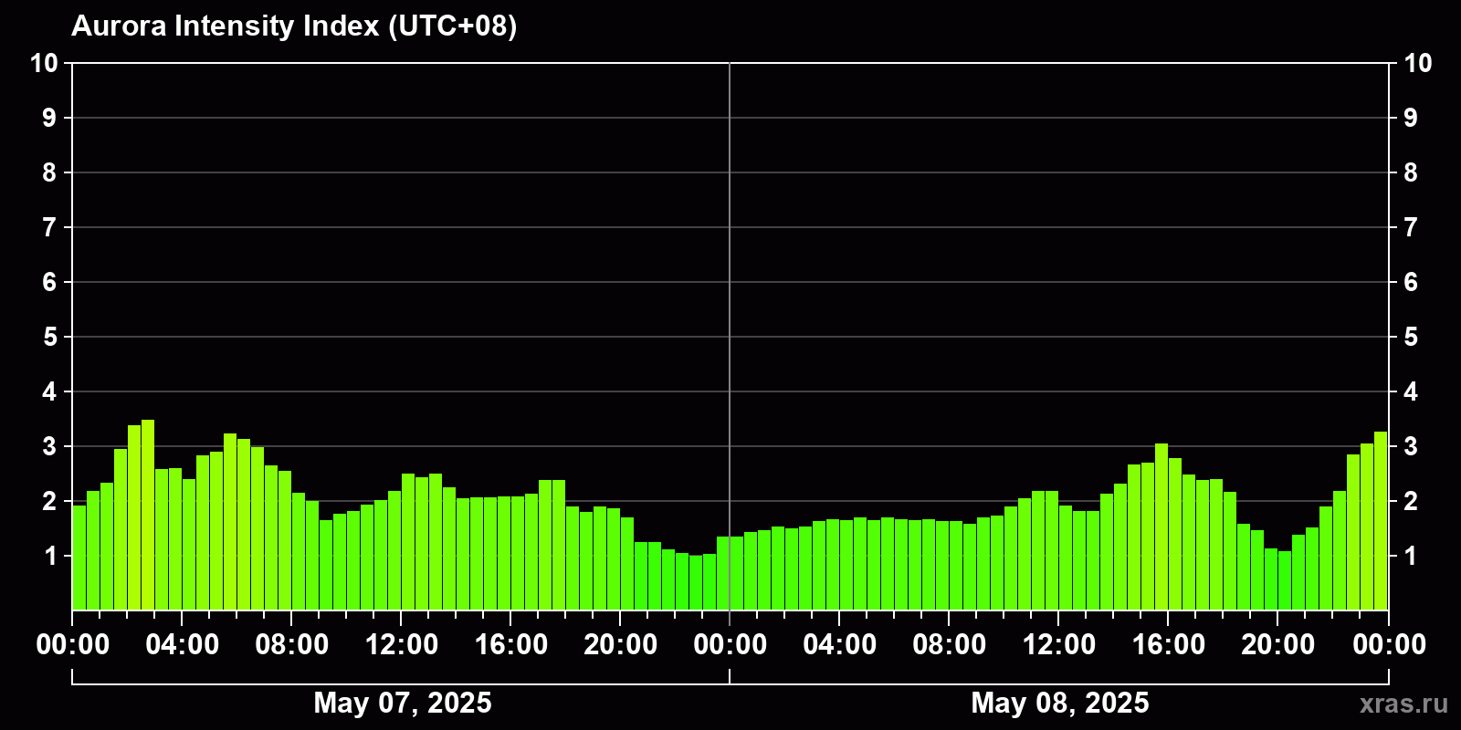 Auroral intensity index and the theoretically possible latitude of observations for nighttime in the Estern Hemisphere as of 2025-05-08 23:55 (end of day) local time