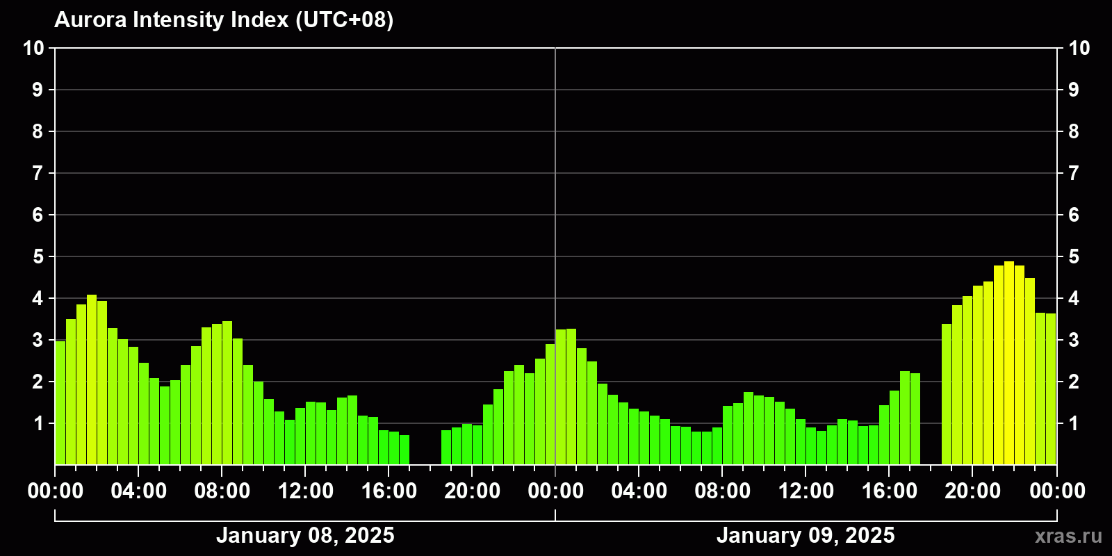 Auroral intensity index and the theoretically possible latitude of observations for nighttime in the Estern Hemisphere as of 2025-01-09 23:46 (end of day) local time