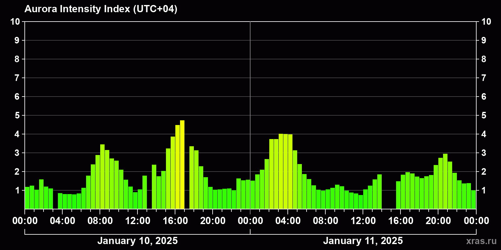 Auroral intensity index and the theoretically possible latitude of observations for nighttime in the Estern Hemisphere as of 2025-01-11 23:49 (end of day) local time