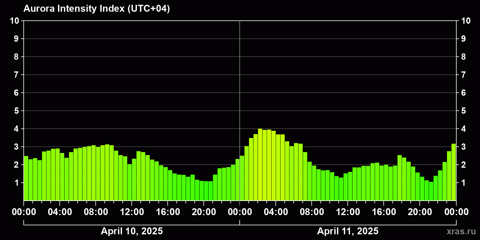 Auroral intensity index and the theoretically possible latitude of observations for nighttime in the Estern Hemisphere as of 2025-04-11 23:55 (end of day) local time