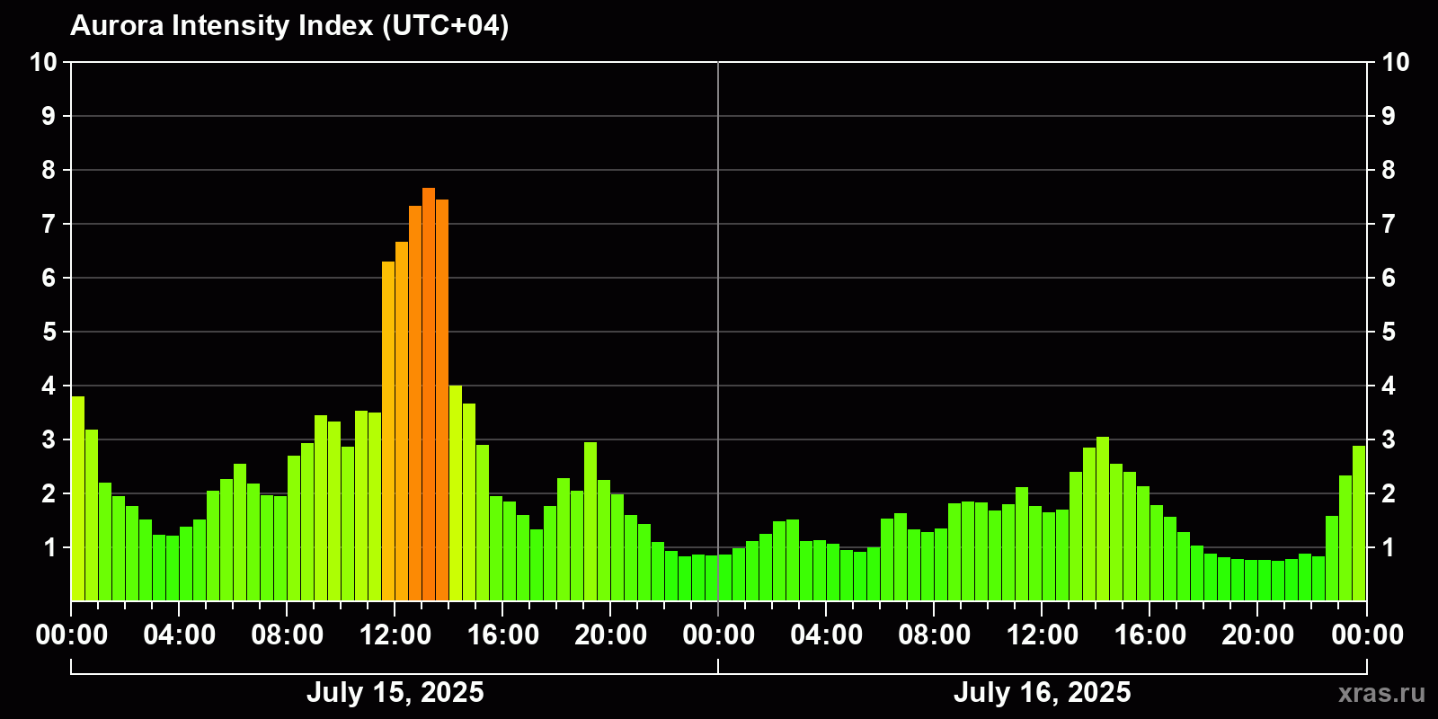 Changes in the auroral intensity index from 2025-07-15 to 2025-07-16 local time