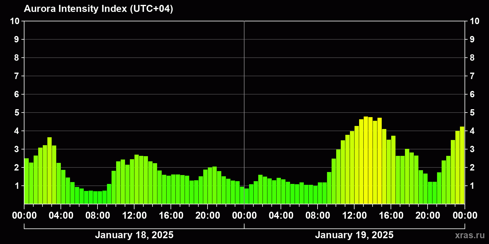 Auroral intensity index and the theoretically possible latitude of observations for nighttime in the Estern Hemisphere as of 2025-01-19 23:54 (end of day) local time